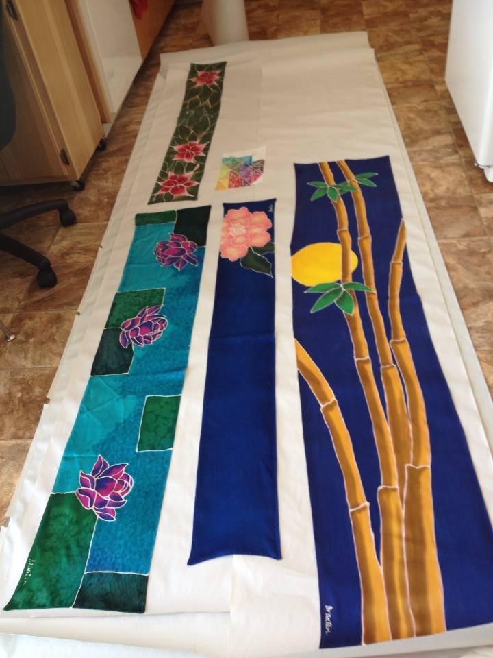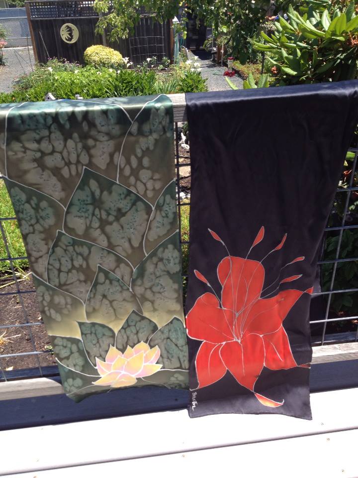 Hibscus in black, Falling Leaves, Aqua Motion, Breath, Dragonfly in blue, Dragonfly in green, Iris.lilies_lotus_bamboo_freakyflowers watercolorscarves