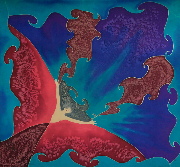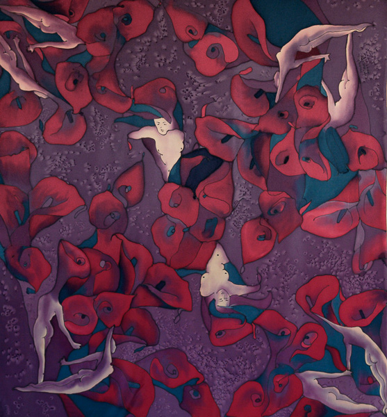 Pandemonium – this scarf is on charmeuse silk, a very luxurious texture. It is 11″x 60″ and feels amazing on the skin. Of course, this design can be ordered in a variety of sizes and textures – all silk.