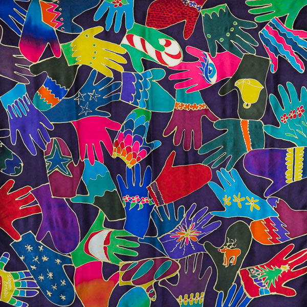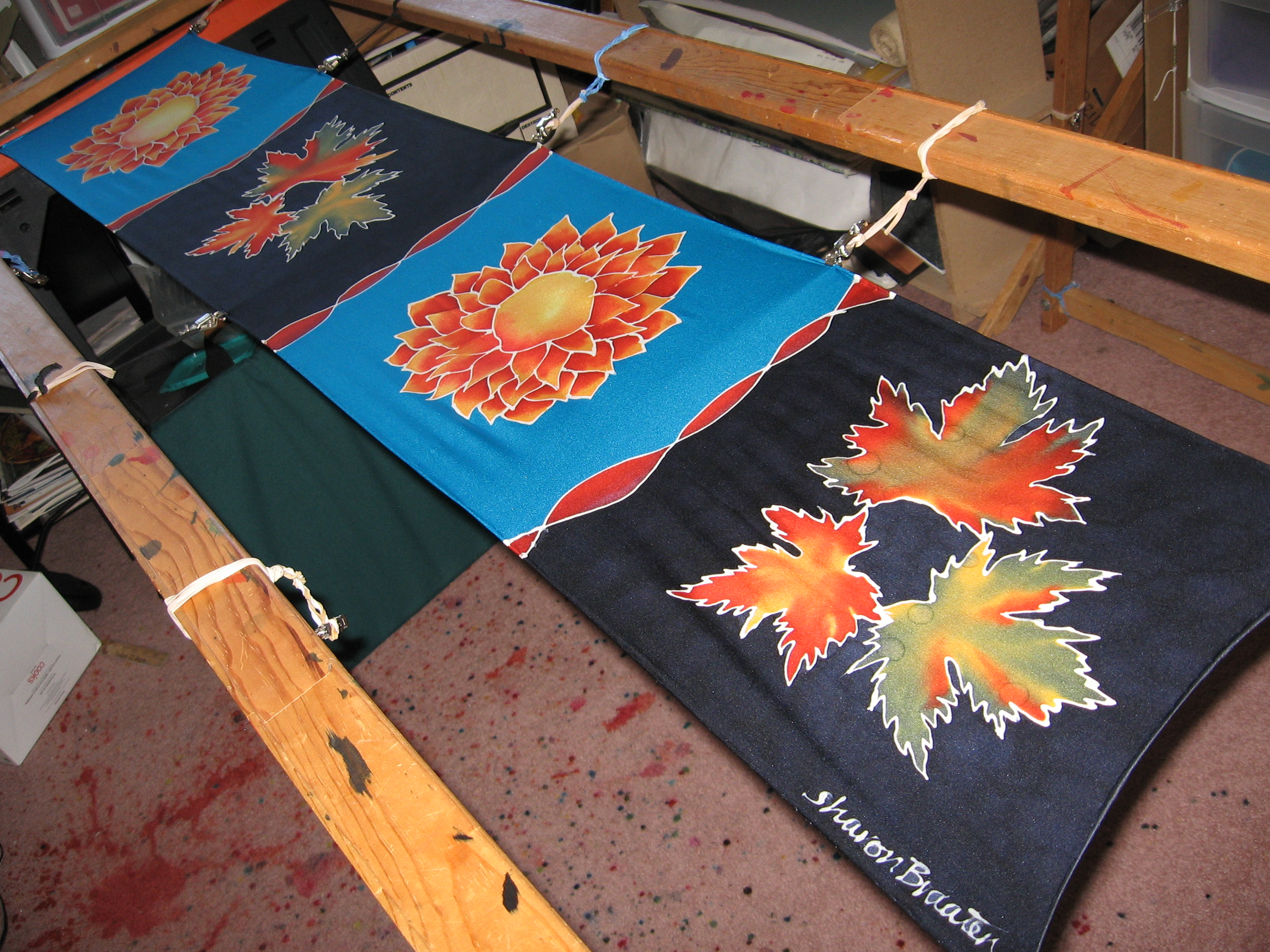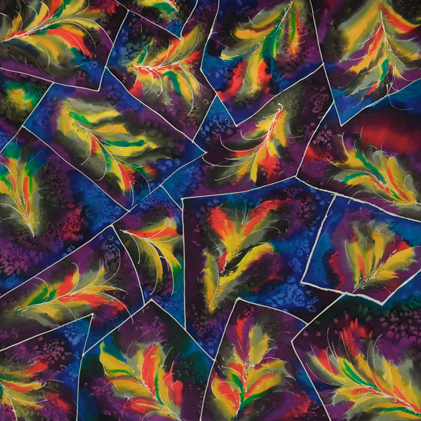 Autumn Leaves – this scarf is on charmeuse silk, a very luxurious texture. It is 14″x72″ and feels amazing on the skin. Of course, this design can be ordered in a variety of sizes and textures – all silk.