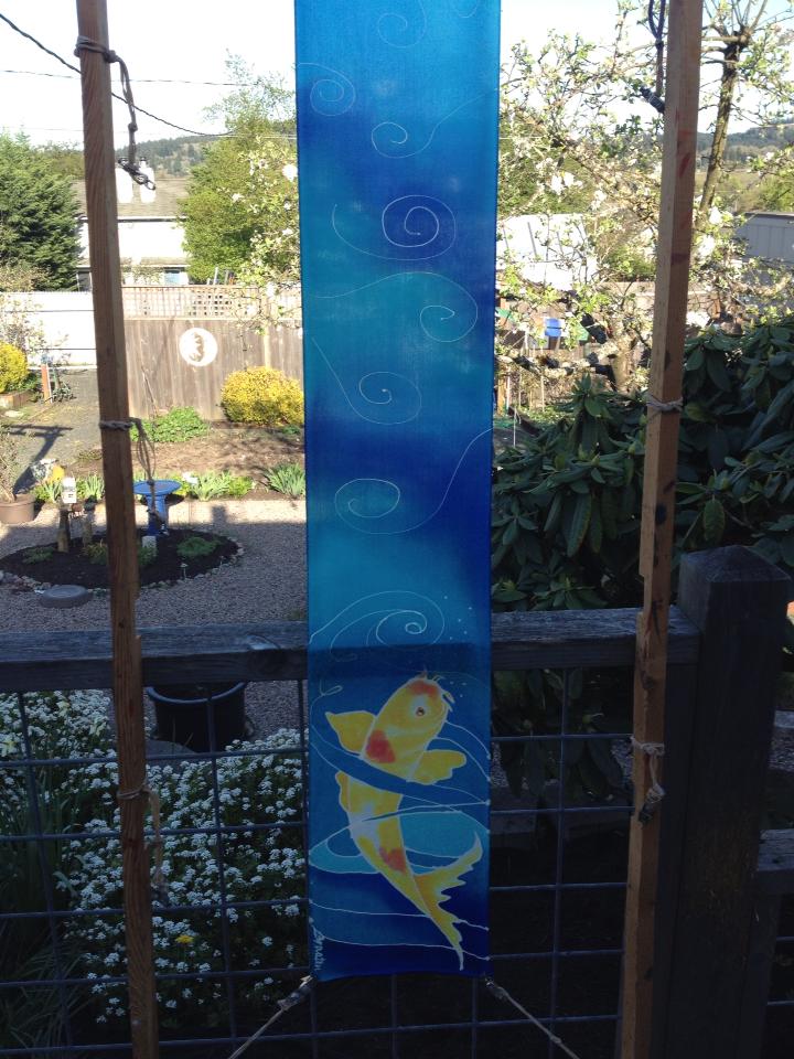 Fishy business – this scarf is on jacquard silk, a very light texture. It is 8″x54″ and will set off most colors you may want to put with it. Of course, this design can be ordered in a variety of sizes and textures – all silk.