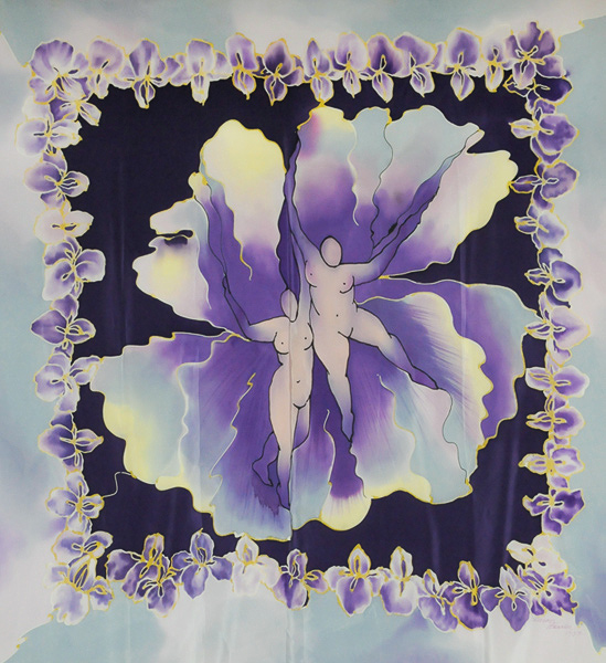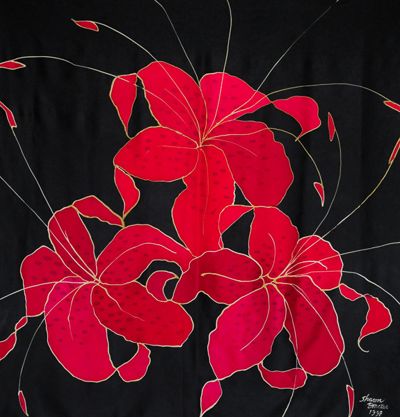 Laughing Lilies – this scarf is on jacquard silk, a very light texture. It is 11″x60″ and will go with a number of colors. This design also comes in a number of color choices as well as a variety of sizes and textures – all silk.